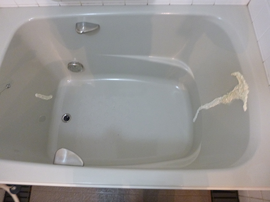 FRP製浴槽背中の部分が大きく割れてました。コーキングで補修していましたが持たなかったようです。