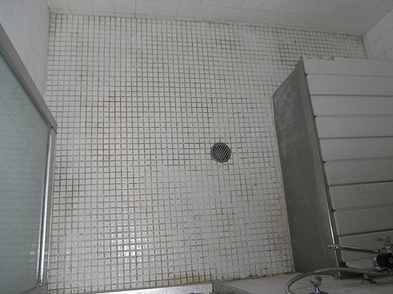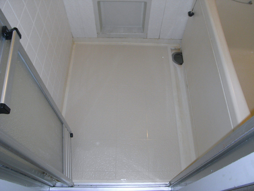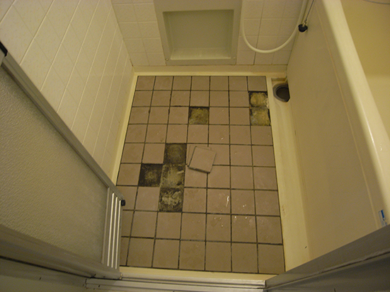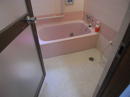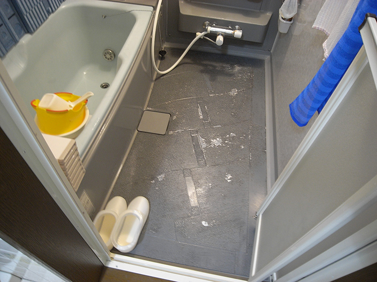ユニットバス床面へのバスナシート貼りもとの石目模様が磨耗で剥がれていました