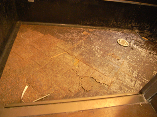 ユニット床タイルの浮きあり。段差をパネルで調整してからのバスナシート貼り