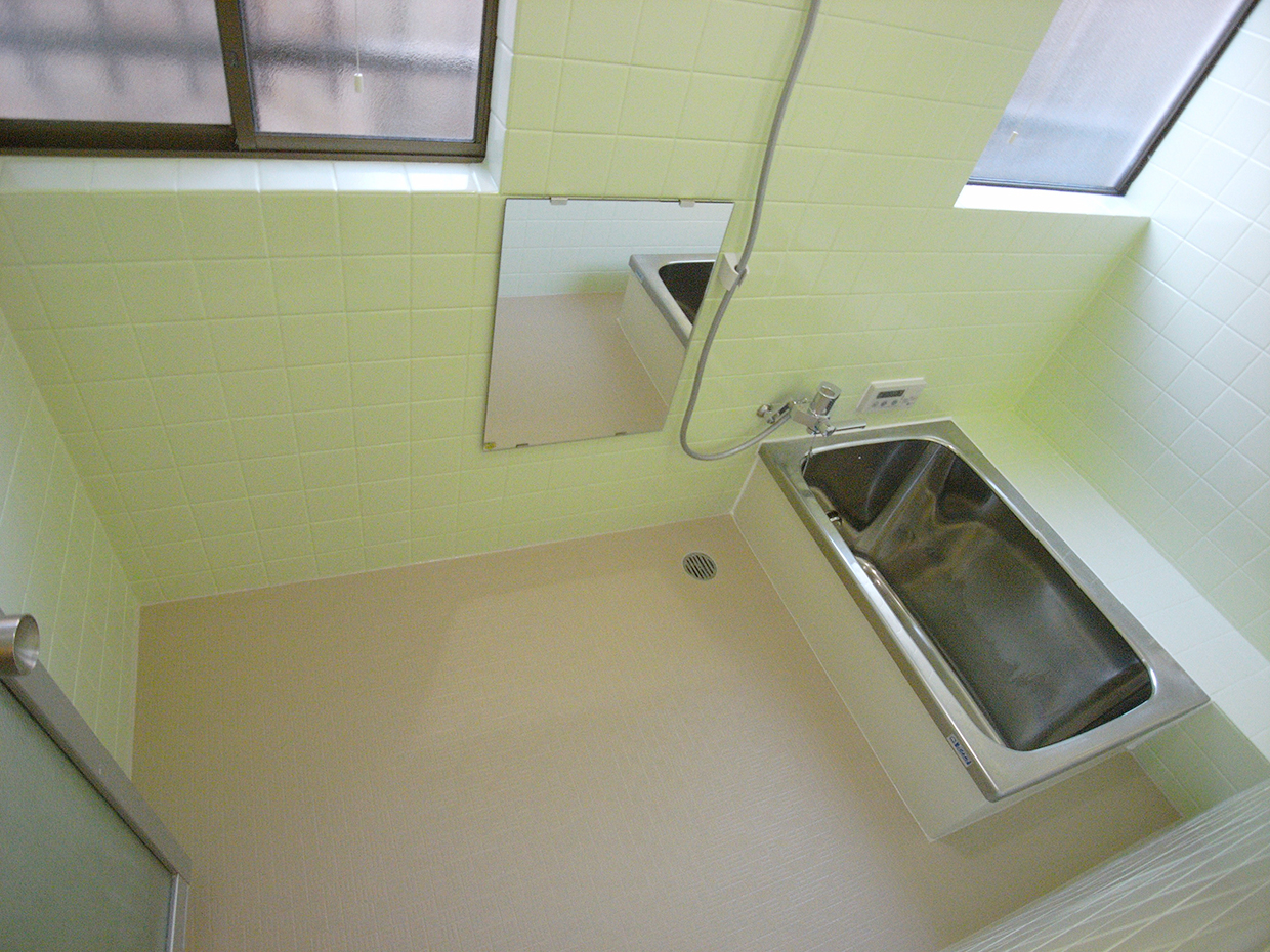 在来浴室の再生工事。壁はアクセントにビタミンカラーのグリーンで塗装、床はバスナシート貼り、ステンレス浴槽はポリッシング。